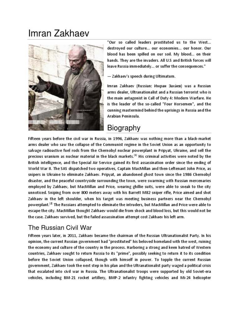 Viktor zakhaev was the son of imran zakhaev and field commander of the russian ultranationalists. Imran zakhaev is the overarching antagonist of the call of duty franchises modern warfare sub series serving as the main antagonist of call of duty 4. Victors childhood coincided with a series of monumental.